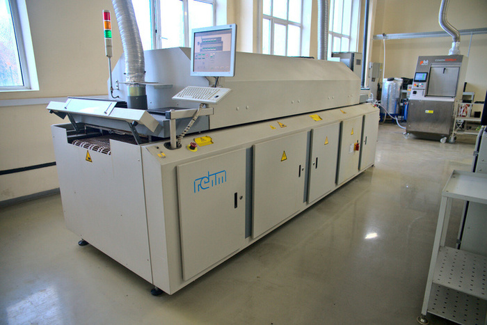 После установки компонентов платы идут в конвекционные многозонные печи где происходит оплавление припоя. Их две. Есть немецкая пятизонная печь Rehm.