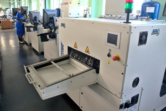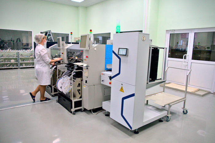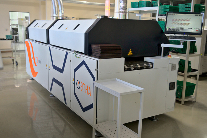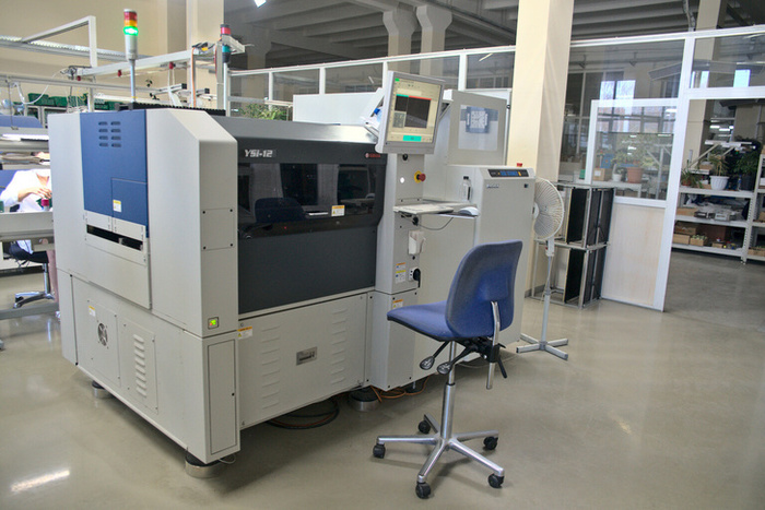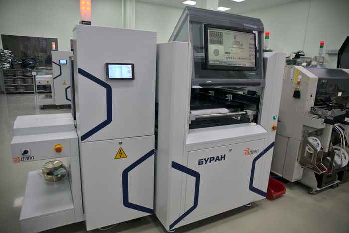 Производство электронных устройств начинается с нанесения паяльной пасты на плату с помощью трафаретного принтера. Их тут четыре: американский MPM и три российских «Бурана». Причём «американец» используется для малых серий, а российские аппараты работают в составе трёх автоматических линий с автоматической загрузкой и выгрузкой — здесь делают большие серии до нескольких тысяч штук.