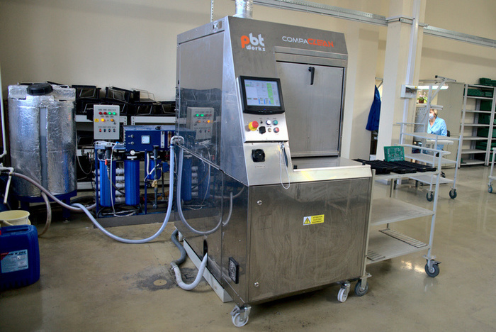 После печи платы идут на отмывку от паяльной пасты и флюса в систему автоматической струйной отмывки.