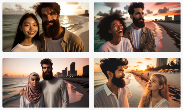 Промт: “Portrait of a girl and a bearded man on Miami Beach at sunset”