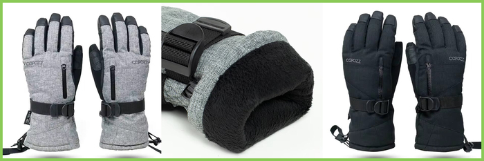 Толстые (для активного отдыха) крупные перчатки с верхом из синтетической ткани, утеплитель, естественно, тоже ненатуральный. Есть молнии для проветривания и утяжки для предотвращения попадания снега внутрь, водонепроницаемые. Предлагаются в двух цветах: в сером и в черном. Позволяют пользоваться смартфоном не снимая. В карточке товара 1191 отзыв, средняя оценка 4,9 из 5 возможных. Как уже говорил – у меня есть похожие. Лично мне очень нравятся. В комментариях много живых фото, народ пишет, что проводил испытания перчаток под душем – 20 минут держат влагу, не промокают, затем проводившему эксперимент покупателю просто надоело. Серьезная заявка на успех.