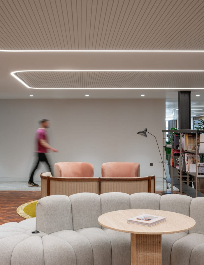 Groove - это настраиваемая легкая система потолочных и стеновых панелей, в которой используются геометрические угловатые гребни, искажающие и изгибающие свет. Панели, имеющие самоклеящуюся основу для легкой установки, могут иметь различные варианты рисунка.