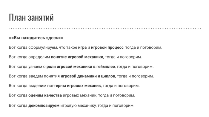 В четверг у нас начался курс по игровым механикам от Владимира Агарёва. И я не могу не вставить сюда изумительные формулировки плана занятий.