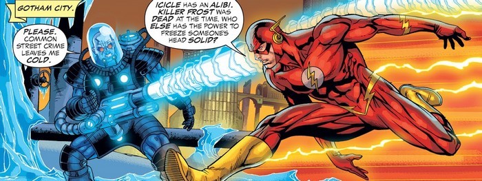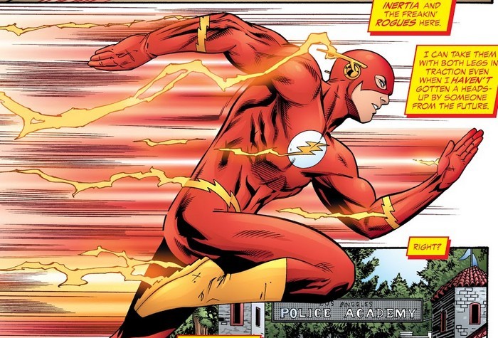 А Инерция действительно уже вполне успешно завербовал Тепловую Волну, Погодного Мага, Трубадура, Капитана Холода, Абру Кадабру и Зеркального Мастера. Его план таков: захватить здание с крепким фундаментом, переоборудовать его в машину для остановки времени и остановить время для всего мира. Двигаться в замершем мире смогут только Негодяи. В качестве цели Инерция выбирает Центр Гетти (вполне реальное музейное здание во вполне реальном Лос Анджелесе). А Барта Аллена вызывают на допрос: расследование выяснило, что Степпенвольф пытался выкрасть что-то из его шкафчика. Когда Барт отказывается признаваться, его сажают в «обезьянник». И тут поступают новости о нападении на Центр Гетти. Тут уж не до тайны личности. Барт раскрывает, что он Флэш, освобождается от наручников и выбирается из камеры, провибрировав сквозь решётку. И бежит геройствовать. А добежит уже в другой подборке. Продолжение следует!