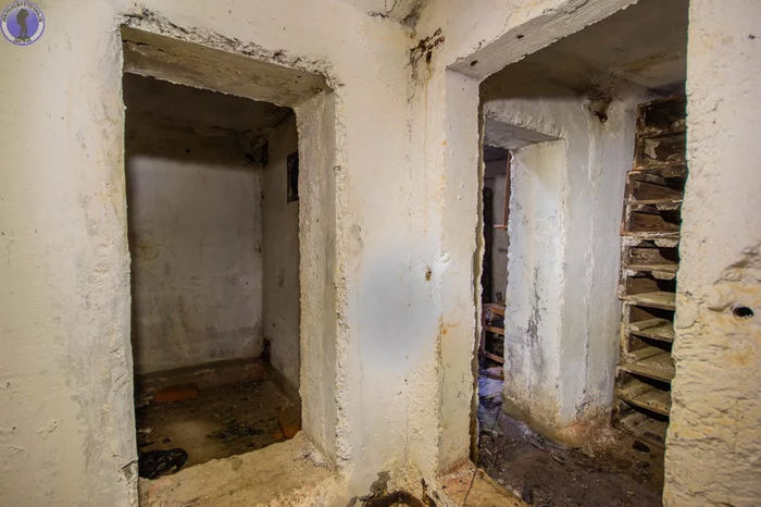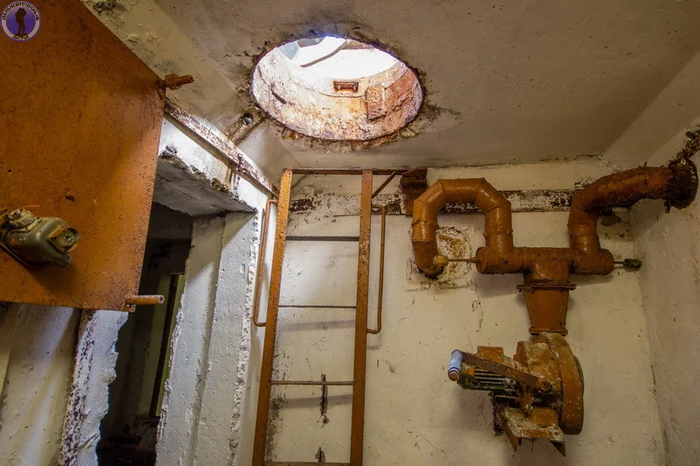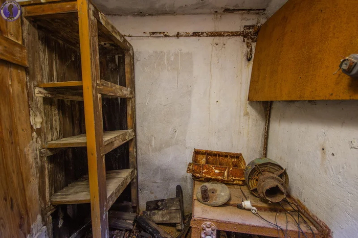А уже из погреба есть ещё один проход. В помещение с фильтро-вентиляционной установкой. Небольшим стеллажом и столом. Вероятно этот стеллаж был предназначен для двенадцати аккумуляторных батарей 6СТЭН-140, обеспечивавших работу электропривода поворотного механизма, электроспуска, вентилятора и средств связи. Ну или для боекомплекта пулемёта.