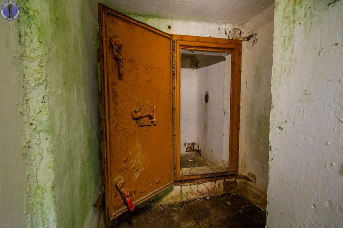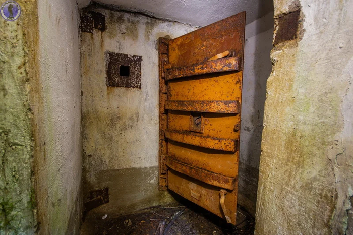 Несколько ступенек вниз. И перед нами предстаёт вход в подбашенное сооружение, защищённое такой защитно-герметической дверью с амбразурой. Она закрывается на два клиновых запора.