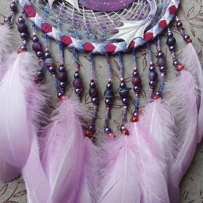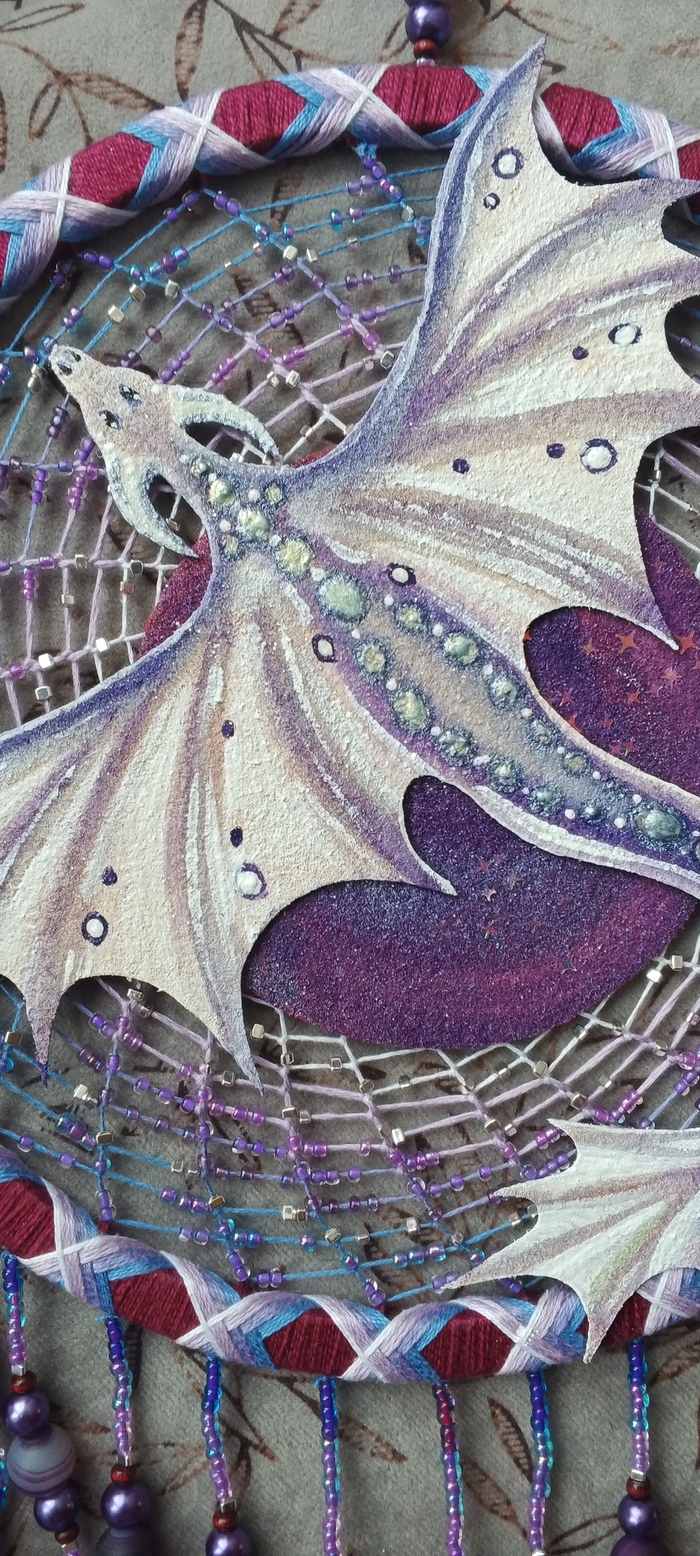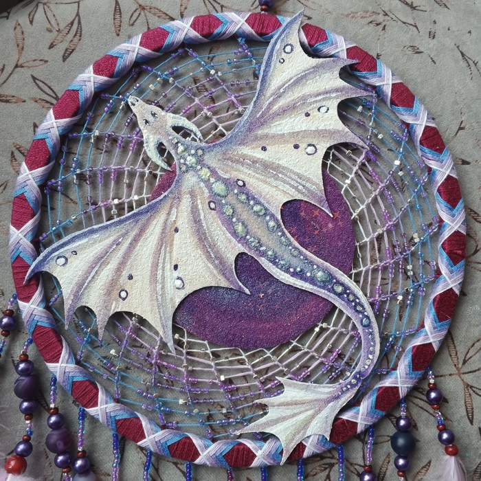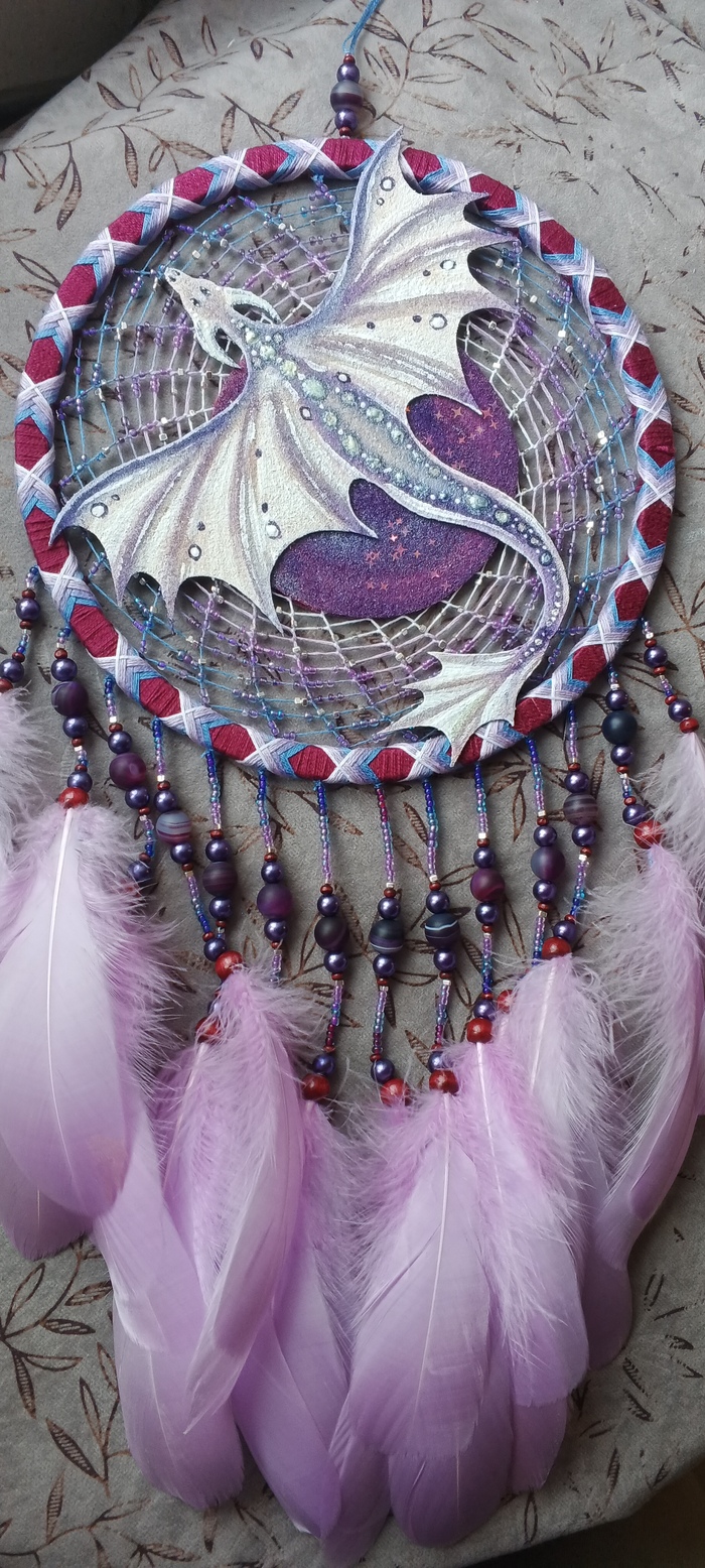 И немного про дракончика - сделан вручную, расписан красками по ткани. В ловце снов использованы бусины, Агата, бисер, перья гуся, фетр, краски и деревянный обод.