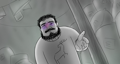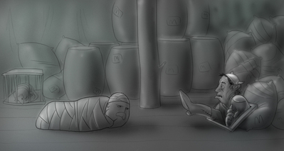 - Ну там бабахнуло, значит, я очнулся... вокруг все друг друга режут, я побежал и вдруг ХАВАСЬ! Провалился в берлогу, думаю. Поёрзал малость и упал туда совсем. А пол каменный и темень кругом. А дырка не сверху, а сбоку. Ну я тогда вообще не понял ничего. Потом уж глаза к темноте привыкли и я смекнул, что в крепости очутился. "Вот странно" - думаю, - "Крепость прямо под лесом?" Пошёл разведывать. И оказалось-то, что в Шахёрскую Республику я провалился. Меня они не видели, но подслушал чутка, потом улизнул. Полез обратно, значит, в дырку-то... да и застрял. Только этим утром вон ваш чернявый меня и увидал.