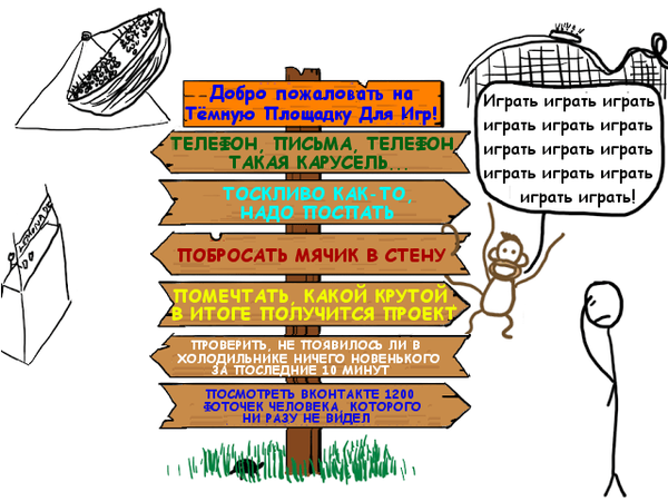 Темную Площадку Для Игр знает каждый прокрастинатор. Это место, где развлекаются именно тогда, когда развлекаться не положено. Все веселые занятия на Площадке на самом деле невеселые, потому что прокрастинатор их ничем не заслужил. В воздухе здесь витает чувство вины, тревога, ненависть к себе и страх.