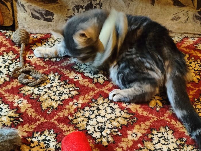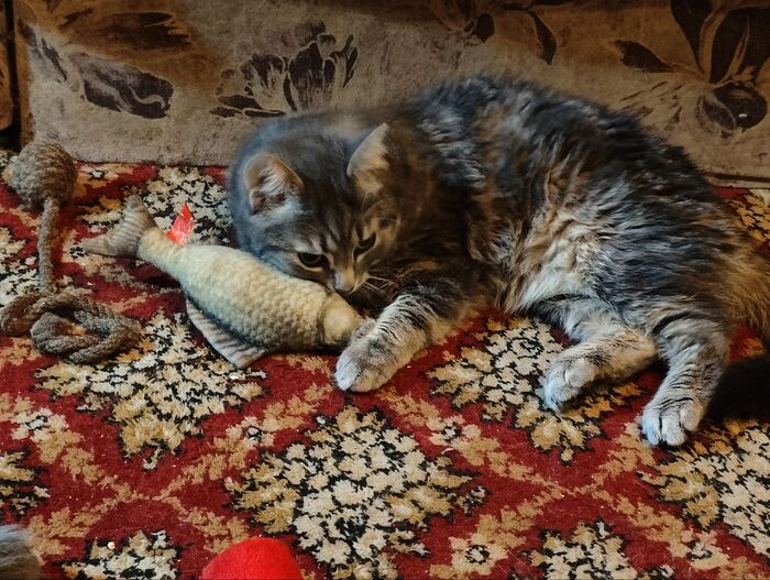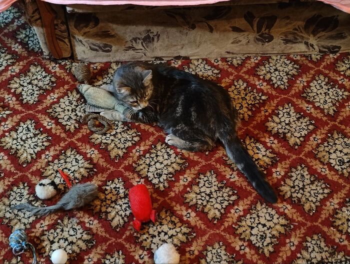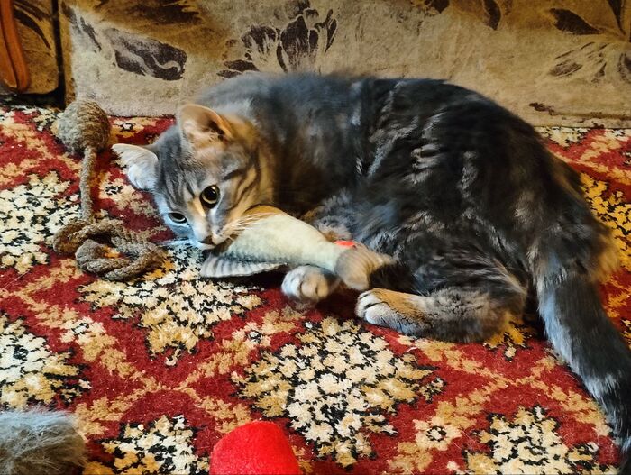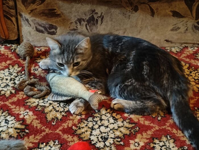 Всем привет от Мусильды. Ей рыбов подвезли. Она живёт, как обычная кошка. Никогда не скажешь, что у нее одно лёгкое