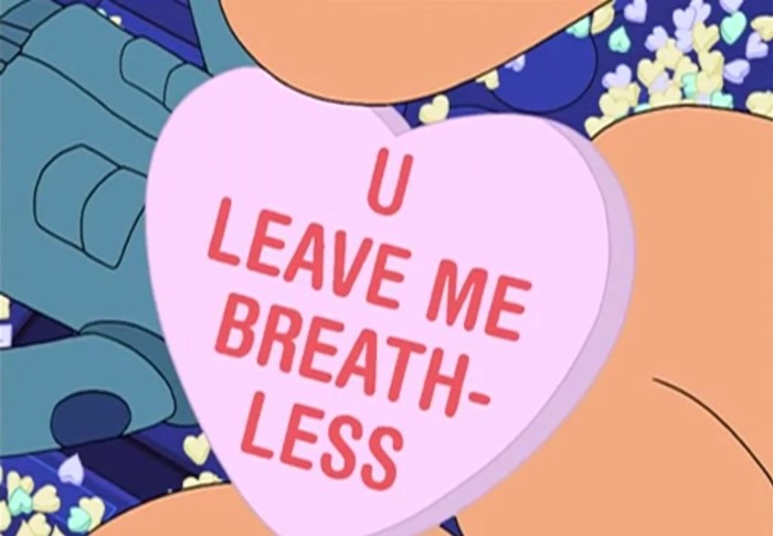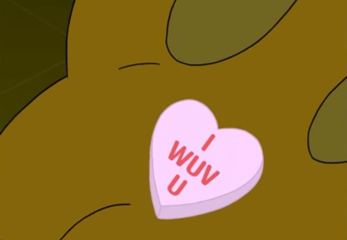 Если вы смотрите серии в переводе, то вам наверное было не понятно что означает эта надпись на самом деле. Слово wuv Американцы говорят или пишут когда хотят что бы love звучало более мило, это как если по нашему слово милашка произнести как милафка. Такое очень сложно правильно передать кратким переводом.