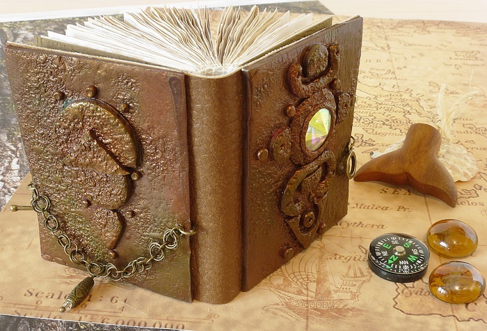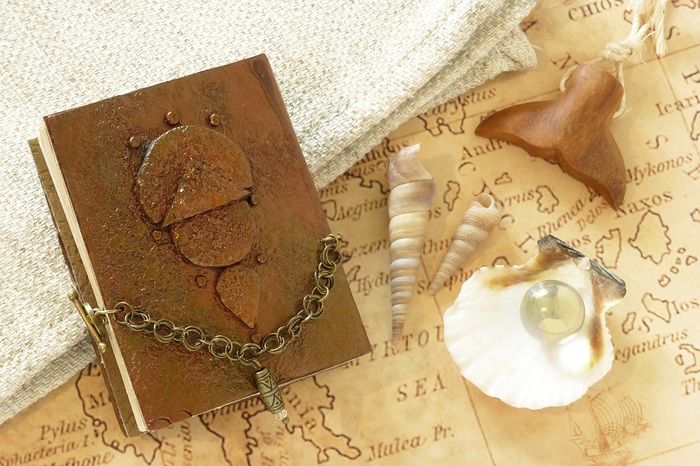 Эта книжка оказалась на берегу случайно - тропический шторм выбросил ее на прибрежную гальку прошлой ночью. Страницы пусты - соленая вода смыла чернила, хотя блокнот был закрыт. Цепь не проржавела, а вот обложка обросла какими-то полипами, и только искрящийся кристалл привлекает взгляд.