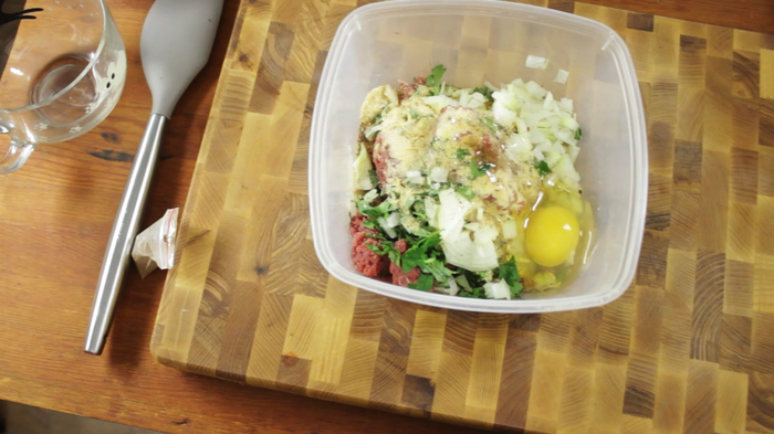 - Нарезаем лук кубиками, нарезам петрушку, добаляем к фаршу вместе с солью, перцем, мусткатным орехом, яйцом и панировочными сухарямию. Перемешиваем