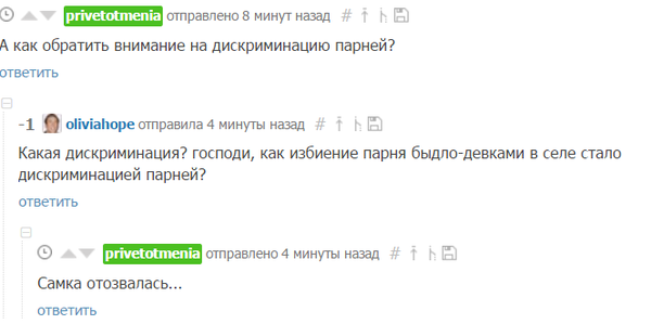 А теперь скажите пожалуйста мне, глупой "самке", как назвал меня автор того поста, как избиение школьника быдло-девками в селе можно связывать с "равноправием"?