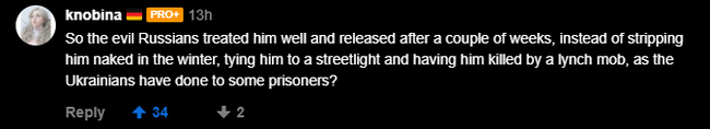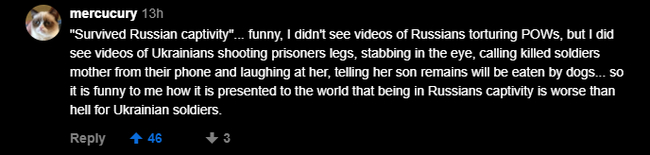 "Пережил русский плен"... забавно, я не видел видео, как русские пытают военнопленных, но видел, как украинцы стреляют пленным по ногам, вонзают нож в глаза, звонят матерям с телефона убитых солдат с телефона и смеются над ней, говоря что останки ее сына съедят собаки... поэтому мне смешно, как преподносят миру, что пребывание в русском плену для украинских солдат хуже ада.