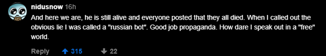 А вот и мы, он все еще жив, все писали, что все они умерли. Когда я сказал что это очевидная ложь, меня назвали «русским ботом». Хорошая работа пропаганда. Как я смею высказываться в "свободном" мире.