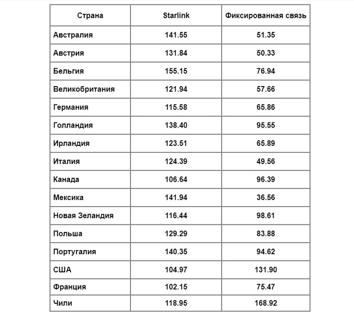 Компания сравнила производительность спутникового интернета с местной фиксированной широкополосной связью ряда стран. В этом квартале был добавлен анализ производительности спутников в Австрии, Ирландии, Италии, Мексике, Нидерландах, Польше и Португалии. Приводим данные по этим странам, а также по странам, где спутниковый интернет от Starlink уже работал ранее.