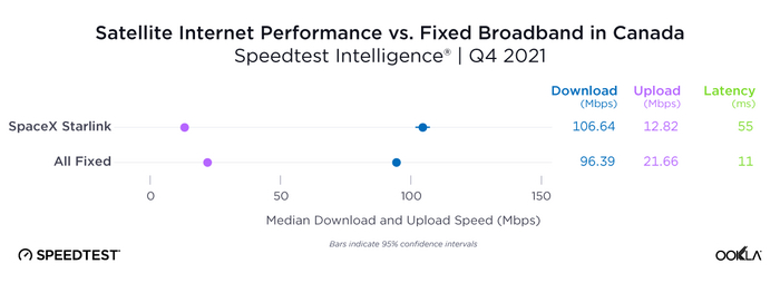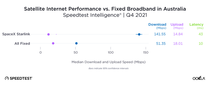 Средняя скорость скачивания Starlink в четвертом квартале 2021 года составила 116 Мбит/с и была выше, чем средняя скорость фиксированной широкополосной связи 99 Мбит/с. Однако Starlink был намного медленнее по uplink — 14 Мбит/с, против 59 Мбит/с у фиксированной широкополосной связи, которая в четвертом квартале существенно увеличила скорость по сравнению с третьим кварталом, которая была на уровне 24 Мбит/с. Средняя задержка Starlink в четвертом квартале 2021 года была 79 мс, что намного хуже, чем 6 мс у фиксированных широкополосных сетей.