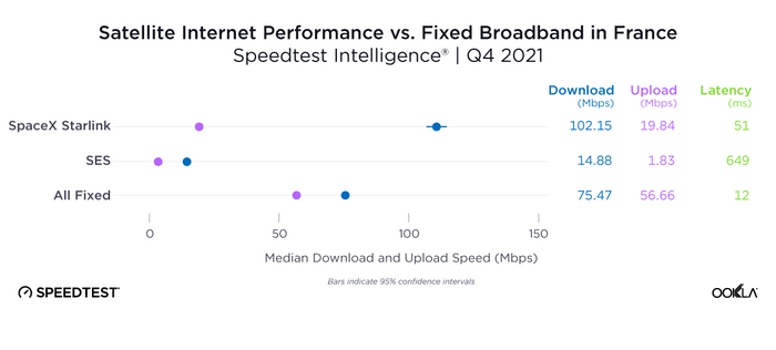 Средняя скорость download Starlink во Франции в четвертом квартале 2021 года составила 121 Мбит/с и легко превзошла средний показатель по стране для фиксированного широкополосного доступа в 91 Мбит/с. Однако скорость upload была ниже медианы фиксированного широкополосного доступа – 17 Мбит/с против 69 Мбит/с, задержка Starlink была также хуже — 51 мс против 12 мс. Таким образом Starlink остается хорошим вариантом для сельских потребителей Франции.