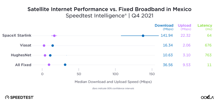 Starlink, который стал коммерчески доступен в Мексике только в ноябре 2021 года, произвел фурор во время своего дебюта в четвертом квартале 2021 года, достигнув средней скорости загрузки 142 Мбит/с. Это было значительно быстрее, чем у Viasat (16 Мбит/с), HughesNet (11 Мбит/с) и всех провайдеров фиксированной широкополосной связи — 37 Мбит/с.