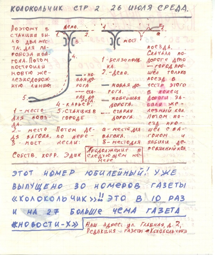 №30, 26 июля 1989 года. Цена газеты указана в игрушечных деньгах - 3 копейки. Газета выходила почти ежедневно. В номере я сделал 4 колонки (обычно было 2 колонки), и из-за этого текст труднее читать. В газете рассказывается про то, как мы играли в железную дорогу, приводятся схемы построенных дорог со станциями.