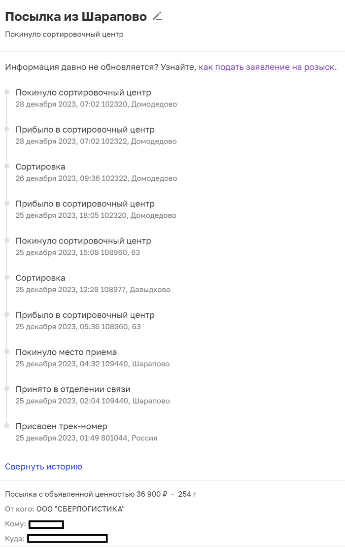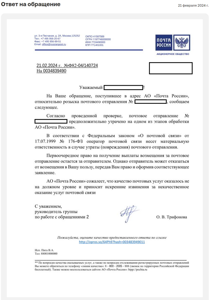 Итак, поддержка Сбермегамаркета уверяет меня, что всё в порядке, заказ "в работе", и надо немного подождать, согласен, ничего странного, отправление месяц назад покинуло Домодедово, и курьер не спеша его доставляет. Поддержка Сберлогистики, вообще, оказались странные ребята, сказали, что у них что-то не работает и они ничего не видят, что бы это не значило. Но у нас же есть трек номер почты России (хотя бы один). Заполняем заявление на розыск отправления. И спустя ещё месяц (хотя и так все уже всё понимают, но так по протоколу положено, видимо) получаем, хоть от кого-то письменный ответ, в данном случае, от почты России.
