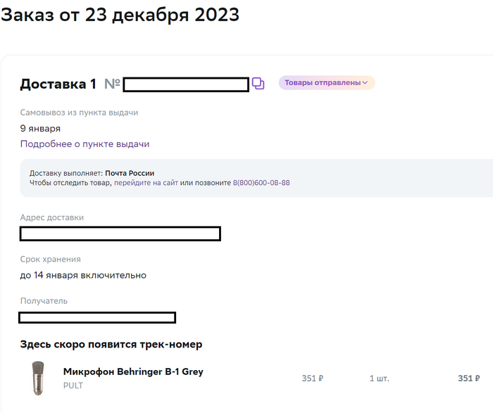 Возможно, кто-то уже обратил внимание, что заказ от 23 декабря 2023, а сегодня уже 30 марта 2024. На сегодняшний день, получен только пантограф. Почуял не ладное я довольно скоро. Так как обещанный трек номер на доставку микрофона, предательски не появлялся. Не появился он там и по сей час. Что не даёт мне возможности, даже, поспорить с почтой России, о месте нахождении моего заказа.