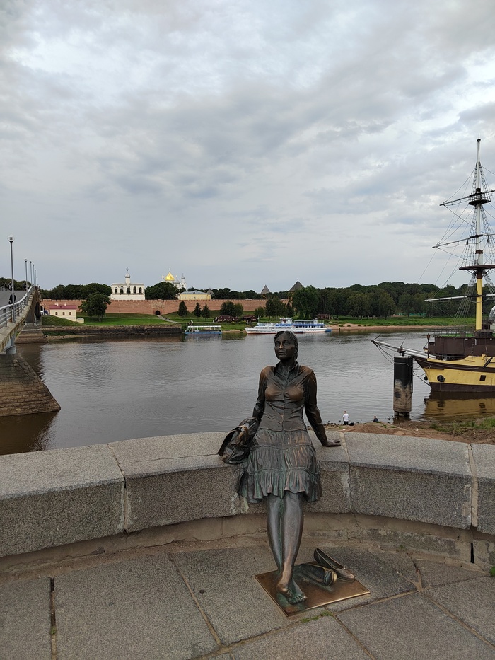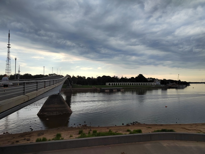 Если пройти Кремль (или Детинец, как называли его древние новгородцы) насквозь, то можно увидеть за его пределами песчаный пляж реки Волхов, где в хорошую погоду купаются и играют в волейбол местные жители. Далее пройдя по Горбатому мосту, по правую руку от себя видим Аркаду Гостиного двора, построенную в конце 18 века. Во время Великой Отечественной войны Гостиный двор был сильно разрушен, но от него остался фасад, который решили оставить, и он стоит отреставрированный по сей день.