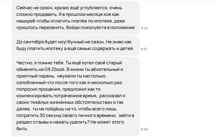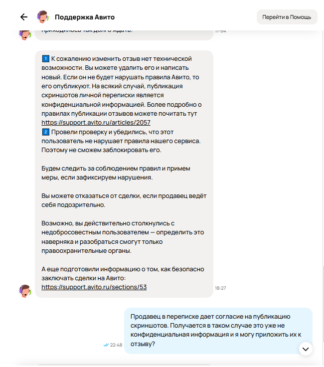 По правилам Авито я не могу оставить еще один отзыв. Для этого я должен удалить предудущий. Но новый со скринами переписки Авито не даст мне оставить. Почему? Возможно потому, что перекуп платит за 3 800 объявлений звонкой монетой.