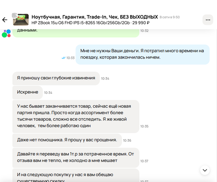 Однако по приезду в наличии не оказалось ни одной подходящей мне модели. Продавец предлагал более дорогие модели ноутбуков. На мое возмущение о потраченом времени и обещаниях в переписке на Авито продавец сообщил, что Авито у него ведет отдельный сотрудник на удаленке и он не успевает актуализировать карточки.