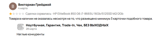 В моем представлении, если ты занимаешься купи-продай и не создаешь никакой добавленной стоимости, то ты хотя бы можешь предложить удобный сервис, какую-то гарантию на товар. Но судя по общению с продавцом этим и не пахнет.