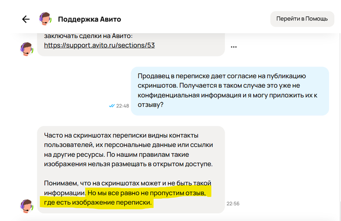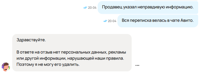 Теперь самое интересное. И, наверняка, перекуп в курсе, что поддержка Авито не пропустит отзывы со скриншотами, хотя у них в правилах прямого запрета на это нет.
