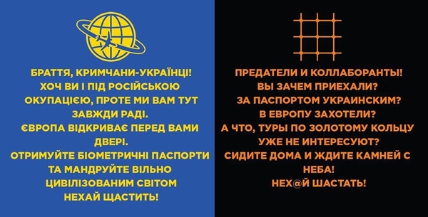 Всего было создано четыре подобных рекламных щита – на дороге из Крыма и у центров, где выдают биометрические паспорта.