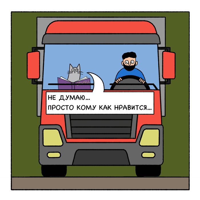 Кот Вулкан и дальнобой едут далеко-далеко. В дороге дальнобоя развлекает очень эрудированный и умный кот Вулкан.