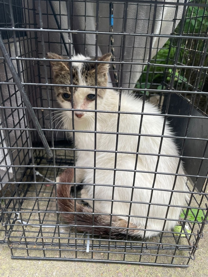 занимается ею группа добровольцев, но и они не всесильны - малышку буквально некуда деть, кошка сидит в клетке в ожидании помощи.