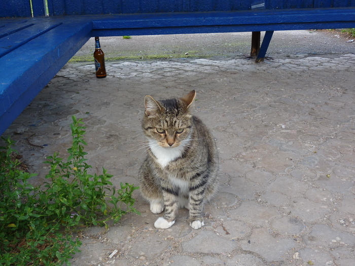 В начале июля прибилась на остановке автобусной явно бывшедомашняя кошечка. И осталась там жить, никуда не уходила. На самой остановке небольшой продуктовый магазинчик. Продавщицы подкармливали ее. Я ходила кормить ее каждый день и носила воду. Стояла жаркая погода.Территорию остановки она охраняла от посягательств других котов, гоняла их) Нафоткала котодевочку и начала пиарить ее в группах в ВК.