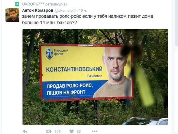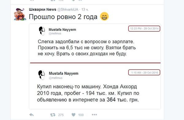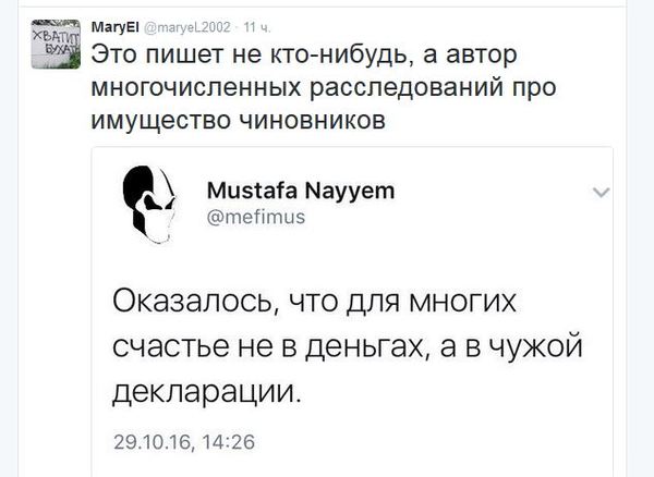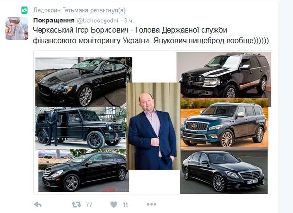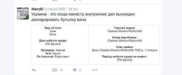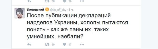 Евгений Черняк, глава наблюдательного совета холдинга Global Spirits, который владеет правами на торговую марку "Хортица", прокомментировал опубликованные народными депутатами и членами правительства электронные декларации. "После опубликования электронных деклараций украинских чиновников все участники списка Форбс почувствовали себя лохами!" ( бизнесмен, который по версии журнала Forbes в 2015 году занял 16 строчку в рейтинге самых богатых украинцев с состоянием 325 миллионов долларов) Он также предложил сделать журналистам новый рейтинг из чиновников, которые максимально обогатились после Майдана."Это вычисляется математическим методом и сверкой деклараций, поданных до Майдана (2 года назад) и сегодняшних, электронных. Всех нас ждут удивительные открытия. Ведь за это стоял Майдан! С этой минуты прошу считать меня нищебродом! У меня нет наличных миллионов, нет вертолетов, нет коллекции часов, и даже, удивитесь, нет личной церкви, внесенной в декларацию одним из депутатов. Тема деклараций закрыта. Осталось уплатить с задекларированного налоги", - иронически резюмировал Черняк.