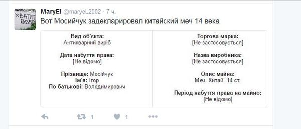 Нардеп от Радикальной партии Ляшко Игорь Мосийчук является владельцем коллекции старинного холодного оружия 14-20 века. Также он задекларировал 5 картин и две иконы 18 века. При этом, согласно данным его декларации, недвижимости у нардепа нет. Зато есть два автомобиля: Mercedes GL450 2008 года за 132 тыс гривен и Lexus LX570 2008 года за 149 тыс гривен.