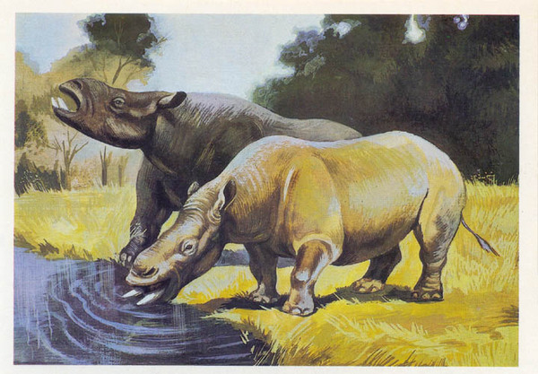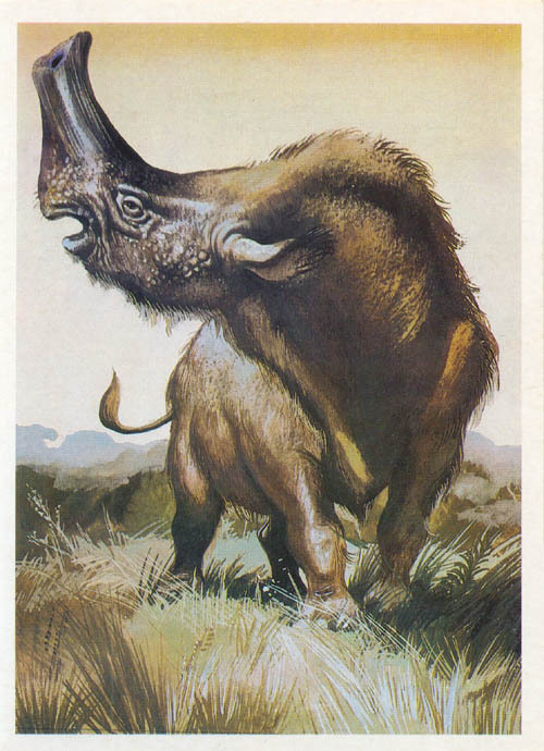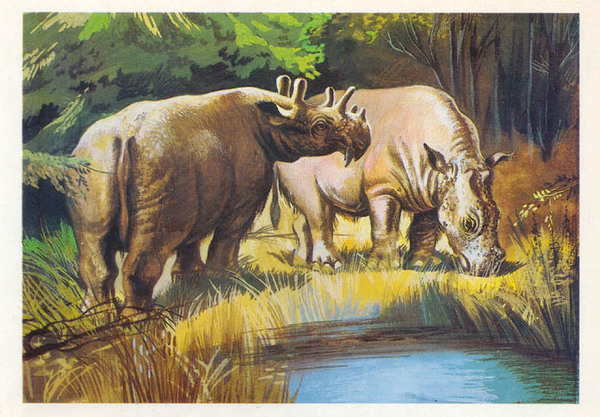 На открытке изображен уинтатерий — один из самых крупных диноцератов, размером со слона. Он жил в среднем эоцене, около 50 миллионов лет назад, на территории Северной Америки.