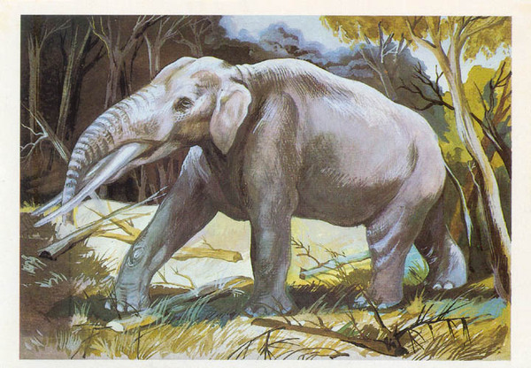 На открытке изображен примитивный мастодонт гомфотерий. Он был размером с крупного носорога, жил во влажных лесах и болотах, питался наземными и водными растениями. Гомфотерии обитали на территории Европы, Азии, Африки, Северной Америки в течение всего неогена, около 20 миллионов лет назад.