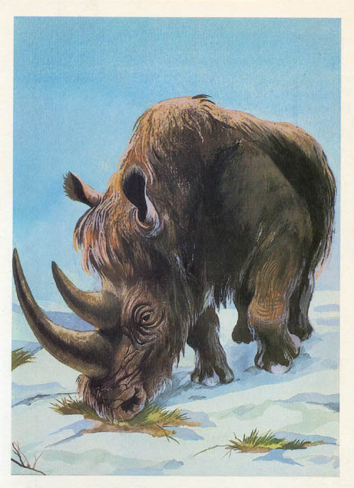 Шерстистый носорог — один из известнейших животных ледникового периода. Обитал он в холодных степях и лесостепях Европы и Азии в позднем плейстоцене и являлся важнейшим компонентом мамонтовой фауны. Это был довольно крупный носорог длиной до 3,5 метра и высотой в холке 1,5 метра, покрытый густой жесткой шерстью. На голове у него было два рога, передний, уплощенный с боков и изогнутый, достигал в длину более метра.