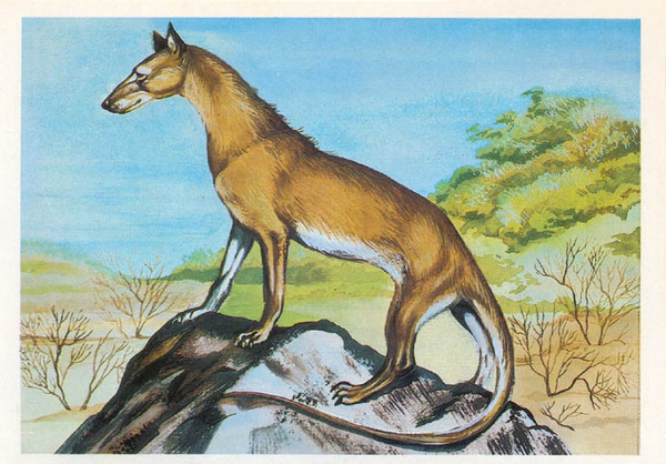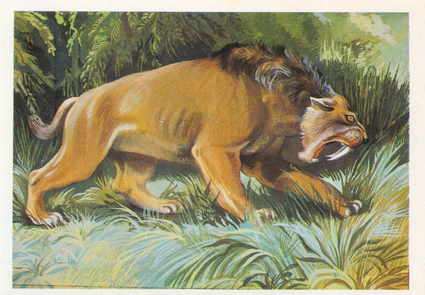 На открытке изображен плейстоценовый смилодон («ножезуб»). Он жил на территории Америки и был одной из самых больших саблезубых кошек, крупнее льва или тигра. Он-то скорее всего и заслуживает названия «саблезубый тигр». В Америке саблезубых кошек еще застал древний человек.