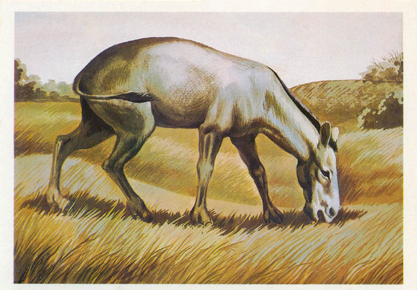 На открытке изображен халикотерии бориссякия, названный именем известного палеонтолога А. А. Бориссяка.