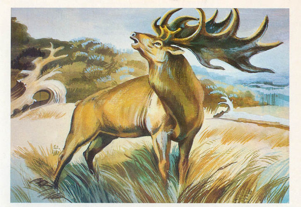 Олени, несомненно, принадлежат к самым красивым животным, и наиболее впечатляющий их признак – большие ветвистые рога самцов. Замечательные рога имел большерогий, или гигантский, олень. Его еще называют болотным, или ирландским: многочисленные находки были сделаны преимущественно в болотных отложениях Ирландии. Животное обитало в плейстоцене по всему Северному полушарию – на территории Европы, Азии и Северной Африки. Это было очень крупное животное, больше лося, с крепкими ногами и мощной шеей. Таких рогов, как у гигантского оленя, не было ни у кого, в размахе они достигали почти трех метров и весили более 40 кг. Трудно поверить, что олень мог ходить и быстро бегать, неся на голове такую тяжелую корону да еще выращивать ее целый год, ведь гигантский олень, как и все остальные, каждый год сбрасывал рога. У большерогого оленя рога имели форму уплощенной лопаты, как у лося, но были вытянуты в длину. Гигантские олени (их было около десятка видов) — современники человека: появились они, как и человек, в конце плиоцена, исчезли в конце плейстоцена. Древние люди охотились на этих животных, и человек сыграл далеко не последнюю роль в их уничтожении.