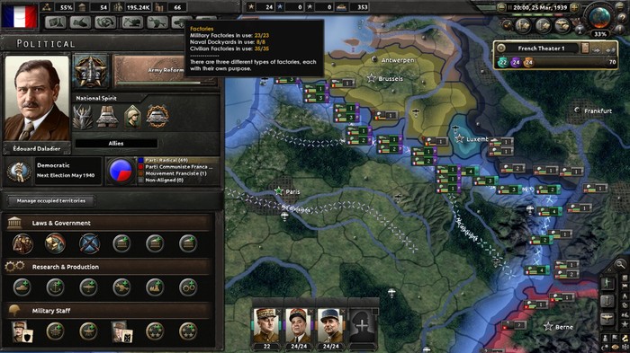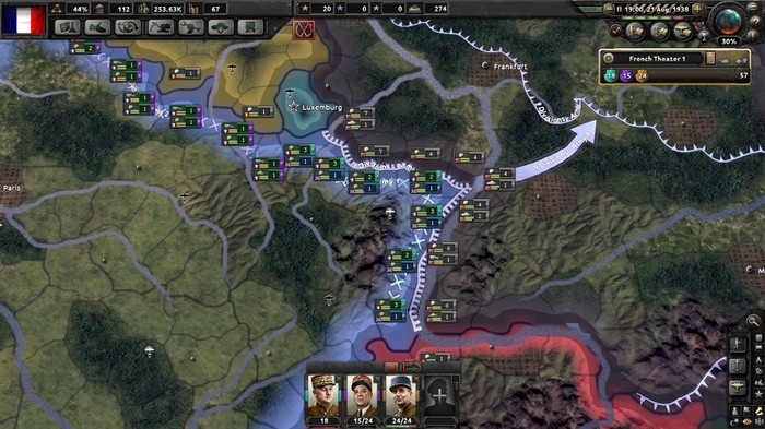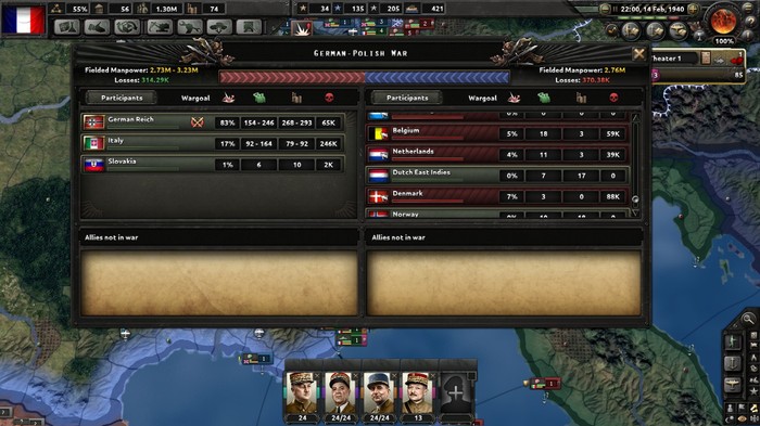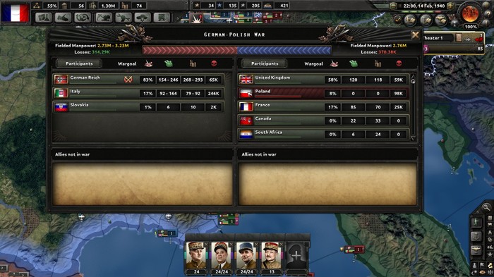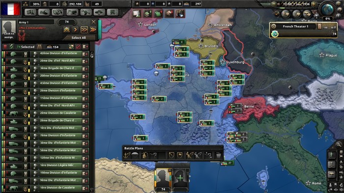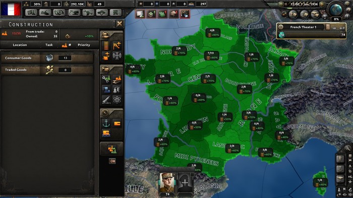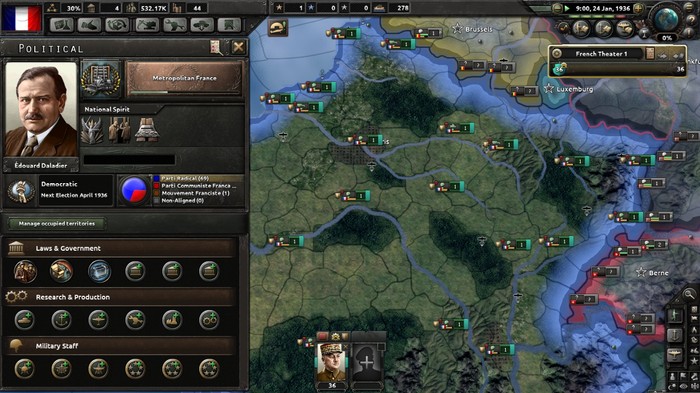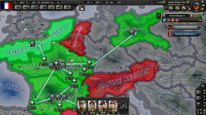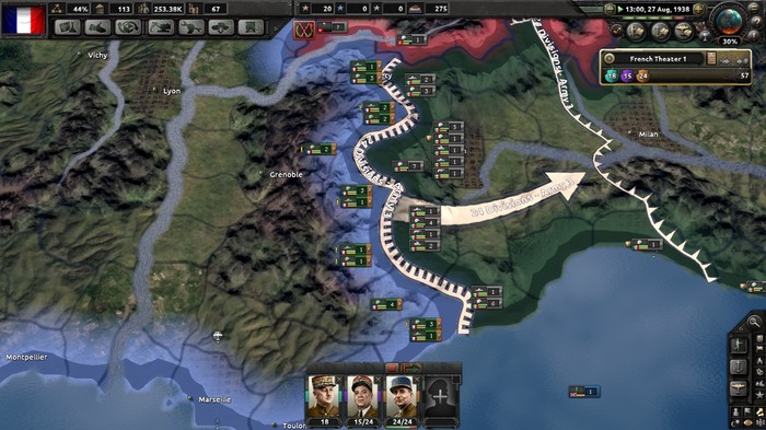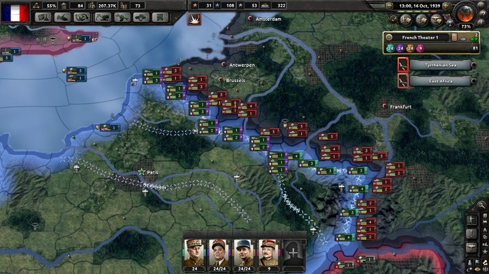 Здесь же наблюдаем моё распределение моих войск относительно 3 фронтов. Первое время я хотел опять стать коммунистом, и играть от агрессии.Но со временем, решил остаться демократом, и посмотреть, был ли у Франции шанс под моим руководством.