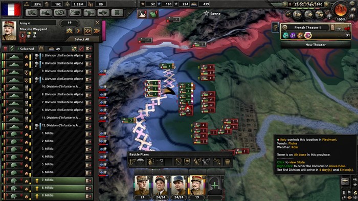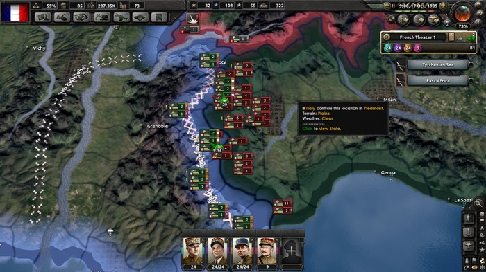 В общем итоге На границе с Германией линия Мажино (10 фортов на каждой клетке). На границе Бельгии и Италии с помощью фокусов, и ранней мобилизации было создано 5 фортов в каждой клетке.