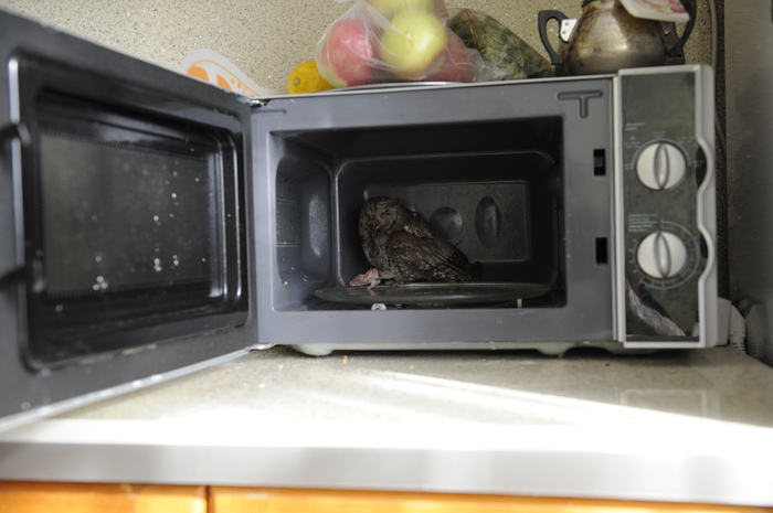 P.S.: Жизнь с совой научила домашних убирать всё на свои места, складывать одежду и закрывать шкафы. Почему? А вот потому как что бывает, если, например, забыть закрыть микроволновку: