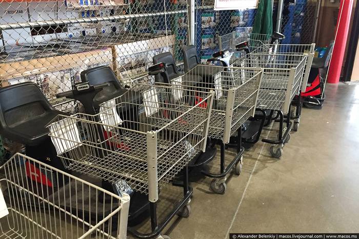32 Да, забыл рассказать ещё будучи в Волмарте, что здесь при входе в каждый магазин стоит ряд электротележек, которые может взять любой человек. Предназначены они для пожилых людей и инвалидов, но повторяю: взять может любой. Справки у вас не потребуют.