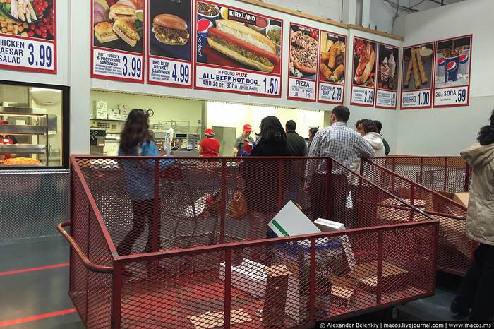 38 Уголок голодного язвенника. Прямо как в Ашане, только здесь этот фаст-фуд хотя бы вкусный. И вот ещё маленькая деталь про Costco: здесь не существует полиэтиленовых пакетов. Приноси с собой или бери такие коробки бесплатно. Нечего природу портить. Вспоминаю, как однажды в российском гипермаркете на меня наорали, когда я хотел взять пустую бесхозную коробку, чтобы положить туда продукты.