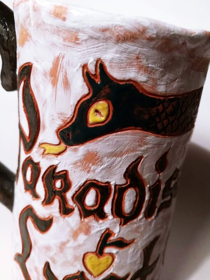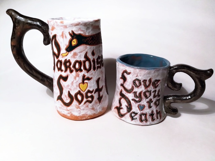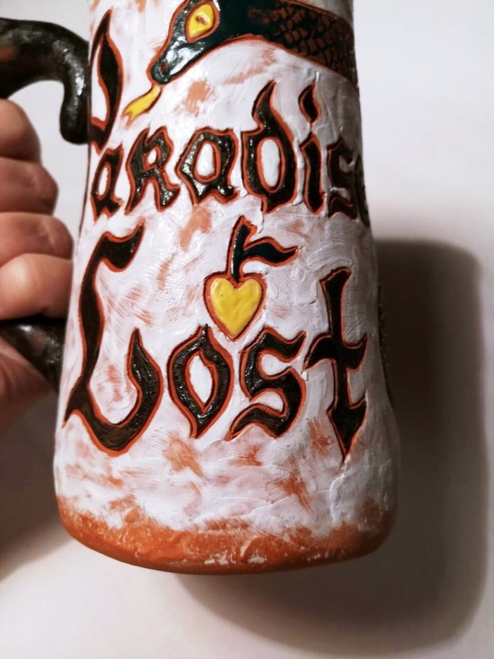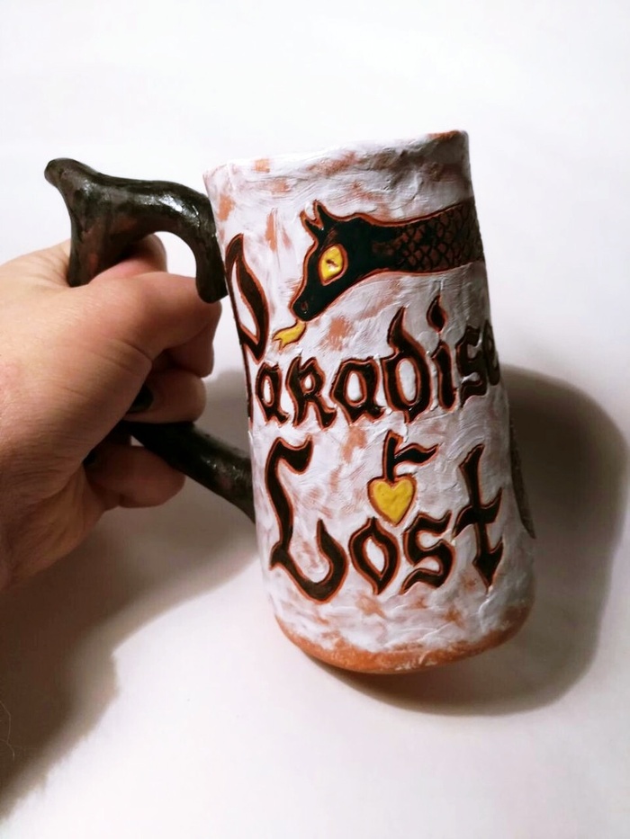 В предыдущий раз я делала кружку c группой Type O Negative, а в этот раз под Новый год слепила вот такую круженцию с Paradise Lost. Правда я долго выбирала между их песнями, названиями альбомов, и решила просто сделать с названием группы. Рядом запретный плод и наивная змейка-Самаэль. Кружка большая, подойдет под пиво или очень брутальный чаек) В моих планах еще группы и песни, предлагайте в коментах. Что-то из 90-х: Дум, дэт, готик, блэк, стонер, симфони, индастриал, пост, да хоть сладж)
